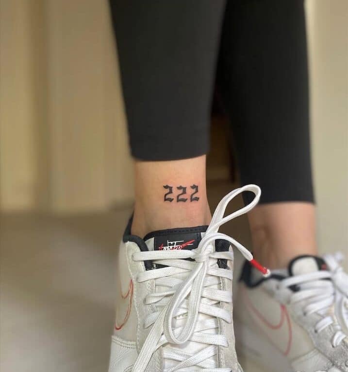 Clean, straightforward 222 in bold black font. Traditional approach makes this tattoo timeless and meaningful.