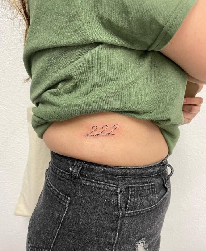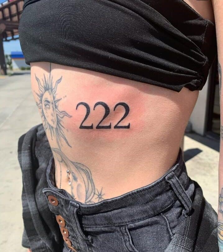 Clean black 222 on ribcage with perfect spacing. Simple yet impactful design for those seeking understated elegance.