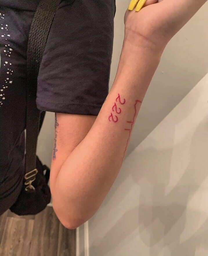 Playful red ink ‘222’ with star accents adds a cheerful twist to the spiritual number. The forearm placement makes this design both visible and meaningful.